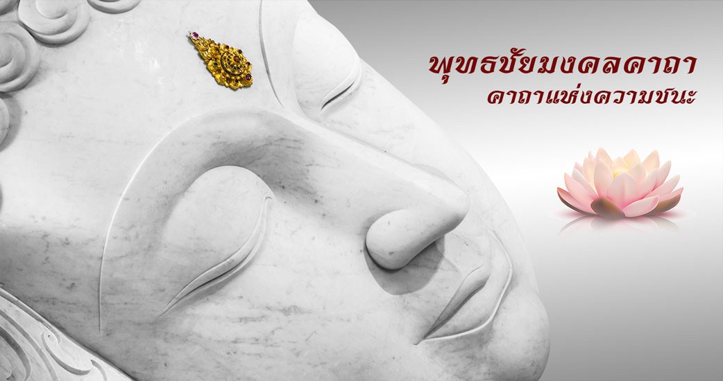 ด้วยเดชานุภาพของพระสัมมาสัมพุทธเจ้าผู้เป็นจอมมุนี ได้ทรงชำนะพญามาร ซึ่งได้เนรมิตแขนตั้งพัน ถืออาวุธครบมือ ขี่ช้างพลายครีเมขล์ พร้อมด้วยเสนามารโห่ร้องกึกก้อง ด้วยธรรมวิธีมีทานบารมี เป็นต้น ขอชัยมงคลทั้งหลายจงมีแก่ท่าน.