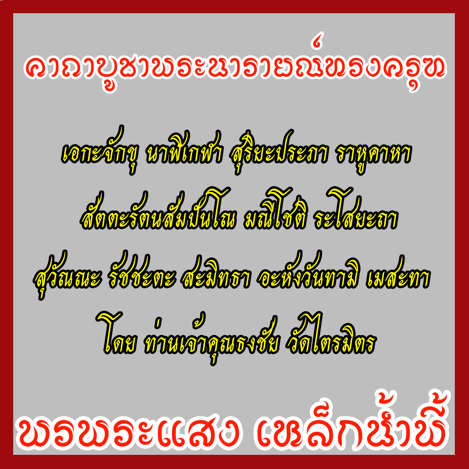 คาถาบูชาพระนารายณ์ทรงครุฑ พระนารายณ์ทรงครุฑประทับพระราหู และพญายันต์ สุริยประภา- จันทรประภา ซึ่งให้คุณทางด้านโชคลาภ ค้าขาย และอำนาจเดชะบารมี ให้ท่องภาวนาคาถานี้อยู่เสมอ ครบ 12 จบ ตามกำลังแห่งพระราหู ผู้ดูแลทรัพย์สินเงิน-ทอง แล้วอธิษฐานขอให้สิ่งที่ต้องการ
